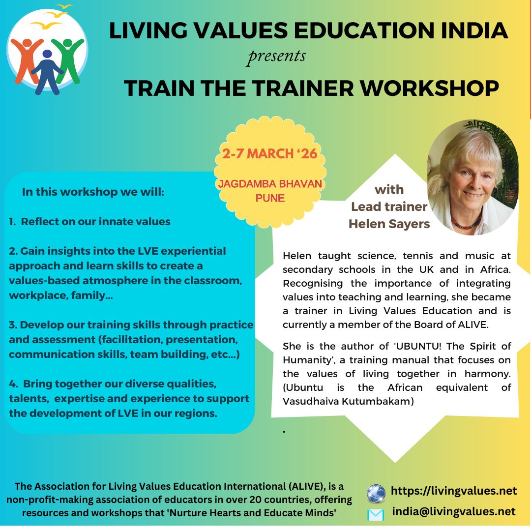 An intensive six-day LVE train-the-trainer workshop for up to 18 candidates from a number of states in India is planned in Pune. These include not only teachers but a number of representatives from other professions such as software engineers, medical doctors, healthcare workers, a chartered accountant, social worker and corporate professionals.