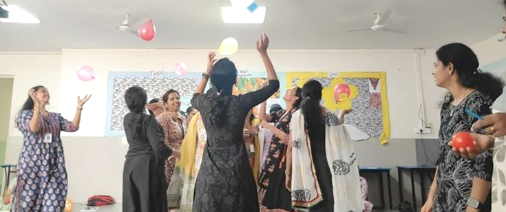 The teachers thoroughly enjoyed this "VALUE BASED ICE-BREAKER", where they had to stand opposite to their selected partner, with an expensive object in between them, when the facilitator calls out some affirmations loudly, the teachers had to perform the relevant gesture for the affirmation and when the word object was said, they had to compete with their partner & pick the object.