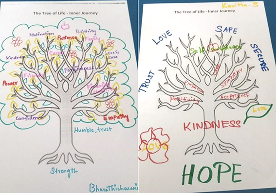 The teachers were guided through an "INWARD JOURNEY" to imagine how a tree and parts of the tree might represent their life and the values they use in their life, to introspect and reflect deeply on each value and qualities which define their personality. This activity encouraged teachers to think creatively and positively, it also greatly empowered them and instilled self-confidence.