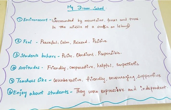This visualisation activity enabled the teachers to go on a pleasant journey and experience a "SCHOOL OF THEIR DREAMS". They explicitly expressed and depicted their expectations about the kind of environment, teachers and students they wished for. They discussed enthusiastically about the right attitude, positive actions & behaviour that is essential to create "A VALUED BASED LEARNING ENVIRONMENT".