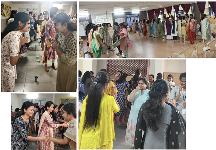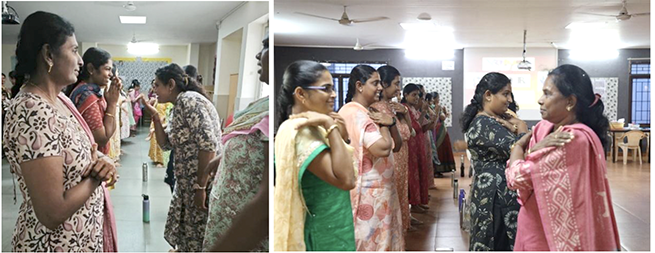 The teachers were made to feel at ease, when "HELLO" was expressed in different languages in a song form. This activity emphasised the importance of meeting and greeting each other to sustain good relationships. It gave a clear understanding on how greeting each other with gestures helps in generating an atmosphere of warmth, friendship and belonging.