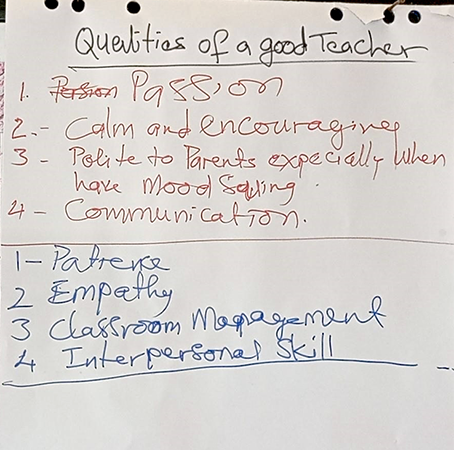 The day concluded with a discussion on the 'qualities of a good teacher'. Both facilitators and participants contributed to the discussion, identifying key characteristics and responsibilities. Evaluation forms were distributed, and participants were guided on how to complete them.