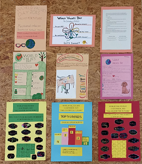 As a speciality and new challenge, the teacher decided to continue dealing with the values chosen for WVD with the sixth class until the end of the school year. Her plan is as follows: each pupil is expected to prepare a page titled "Values" in her/his exercise book. Until the end of the school year, they will choose weekly one value from the posters they made previously. Then they will have the possibility to match an activity to the value. Next week they will discuss the experiences related to the value. At the end of the year everyone will have a list displaying the values they were dealing with. Even the teacher has chosen two values and she will continuously work with them.